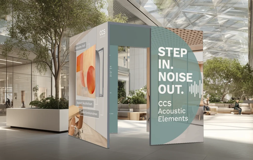 Besonders sinnvoll sind Akustikpaneele, die gleichzeitig gestalterische Funktionen übernehmen. Systeme wie die CCS Acoustic frames aus unserer Produktion verbinden Schallabsorption mit hochwertigem Design und lassen sich individuell an Corporate Design, Raumkonzept und Nutzung anpassen.