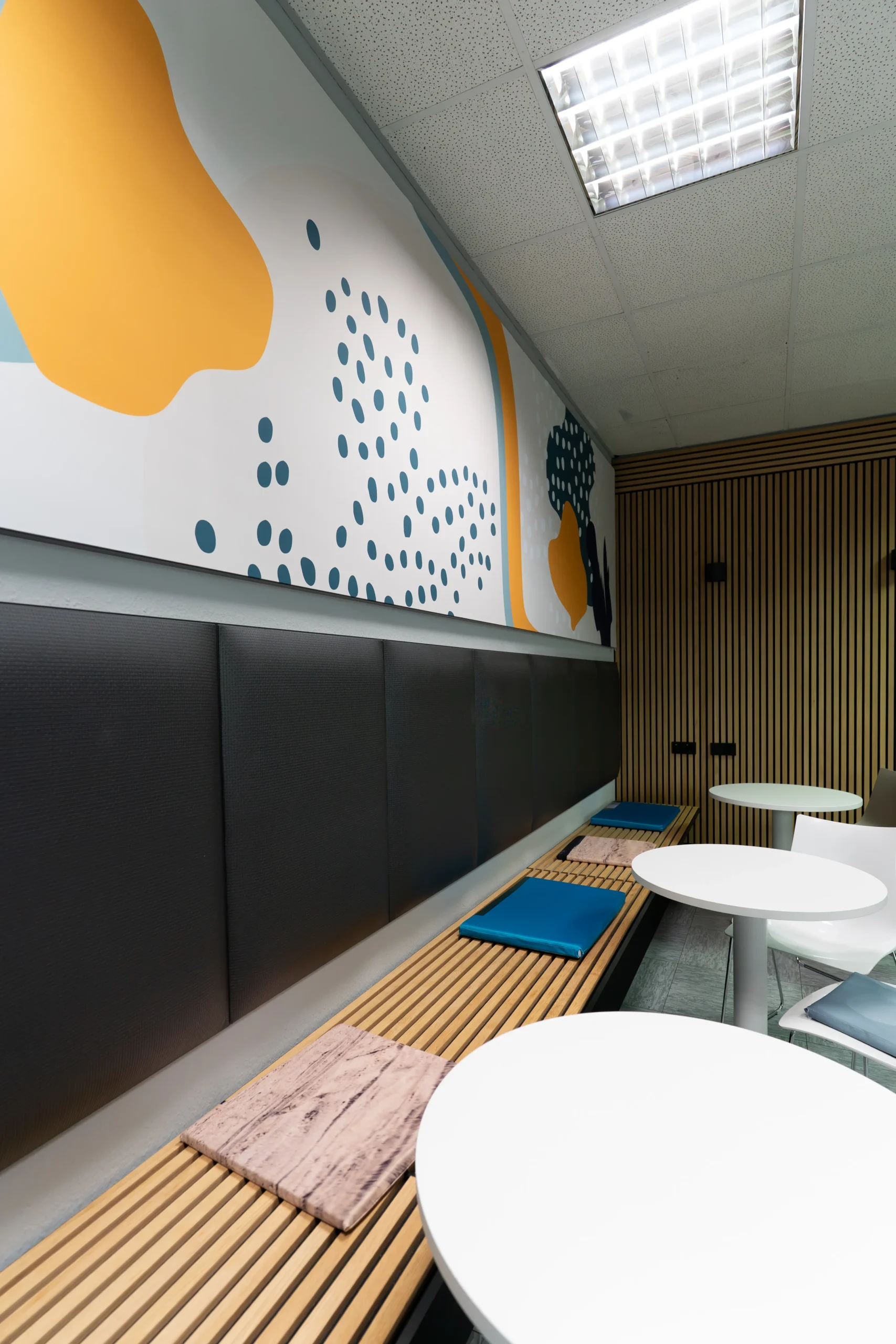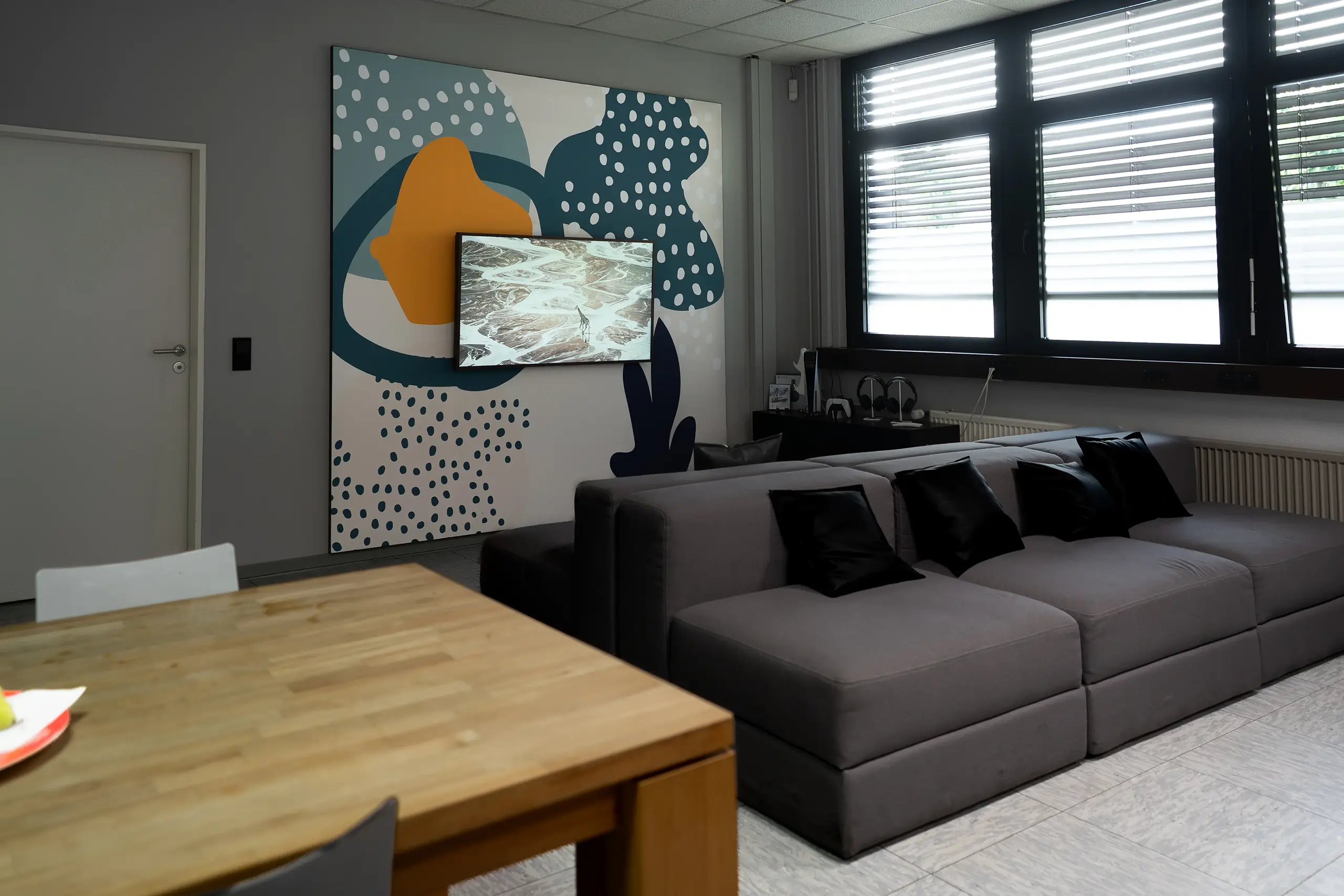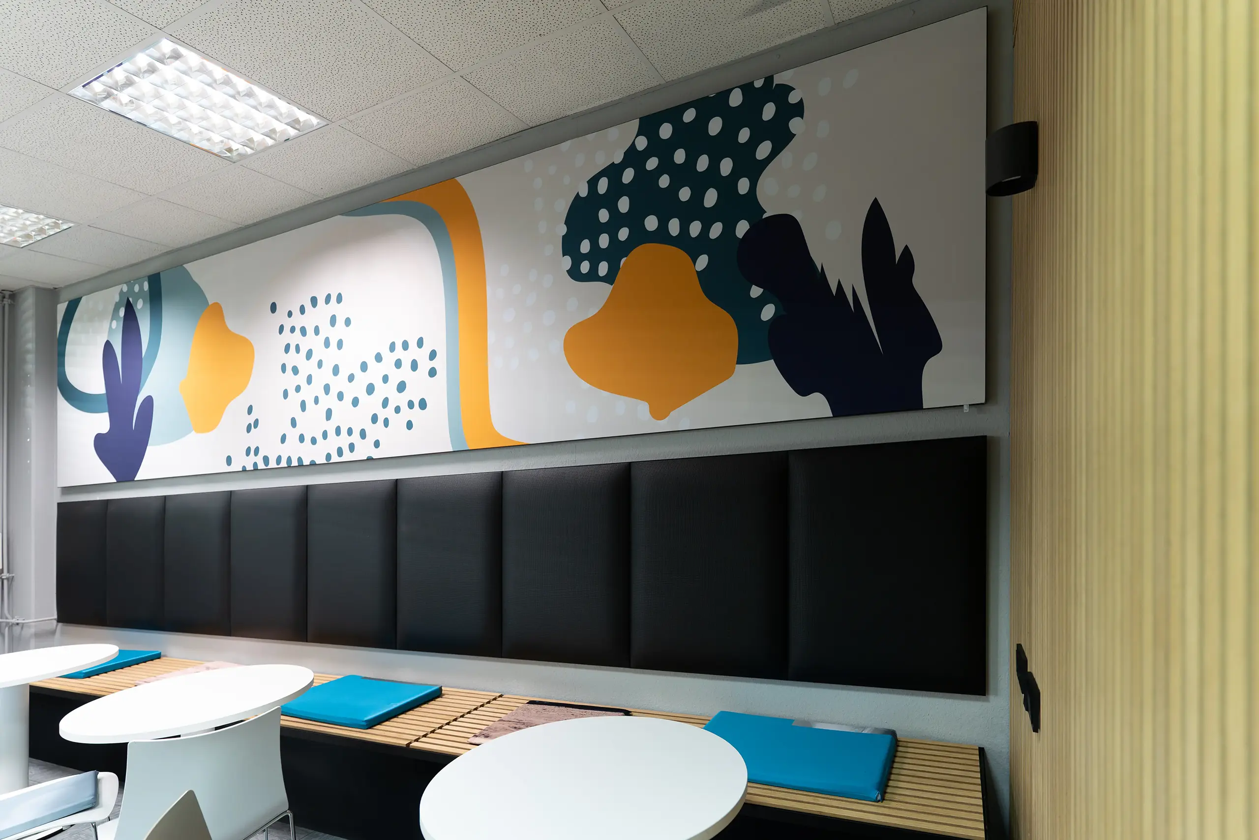 Ein neuer Look für unseren eigenen Pausenraum – das können wir doch komplett selbst! Das In-House-Zusammenspiel aus Grafik und Produktion besteht aus diversen Akustik-Wandbildern, die für eine angenehm ruhige Atmosphäre sorgen und perfekt auf die Räumlichkeiten und Hindernisse wie z.B. den Fernseher zugeschnitten sind.