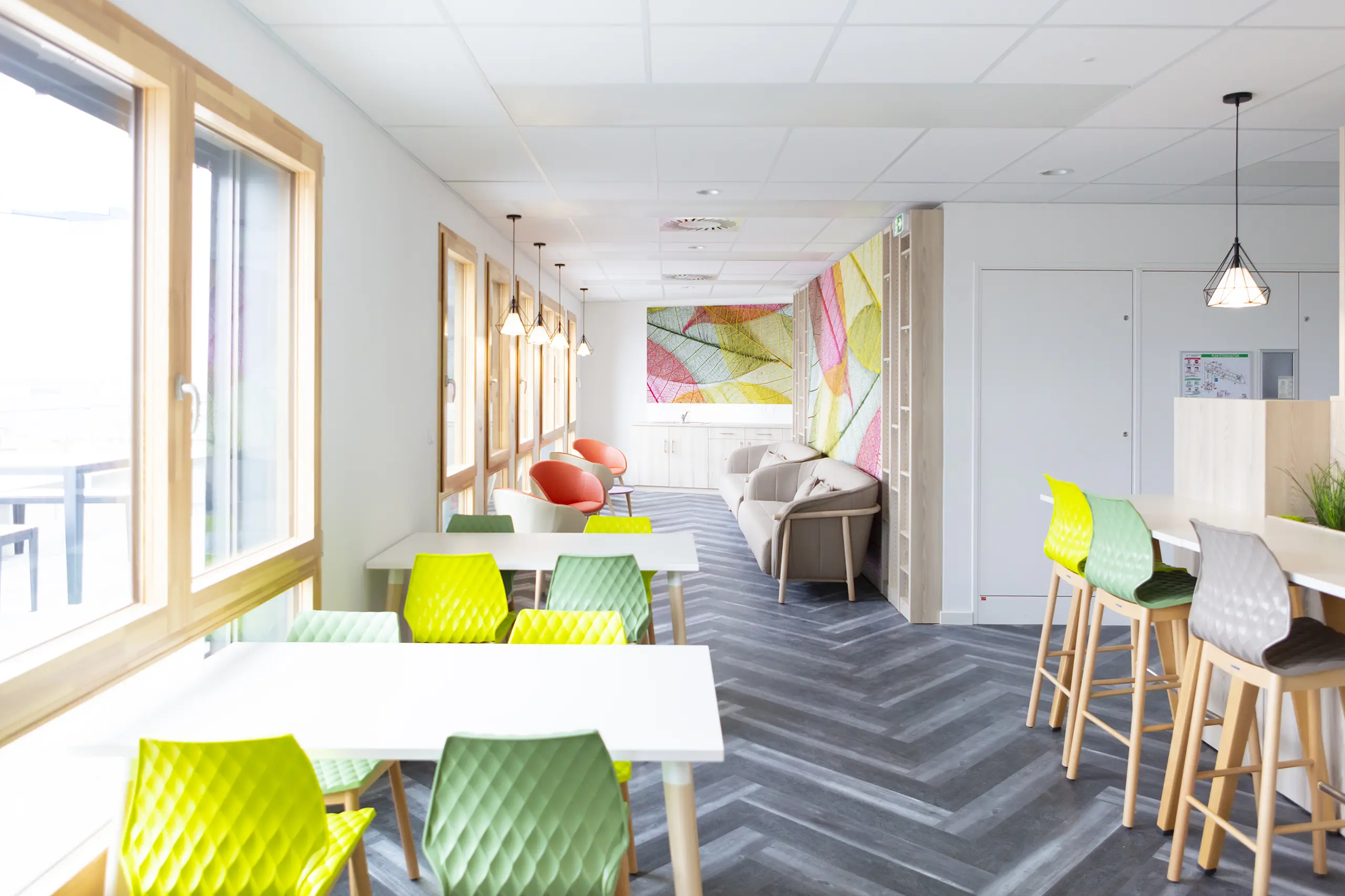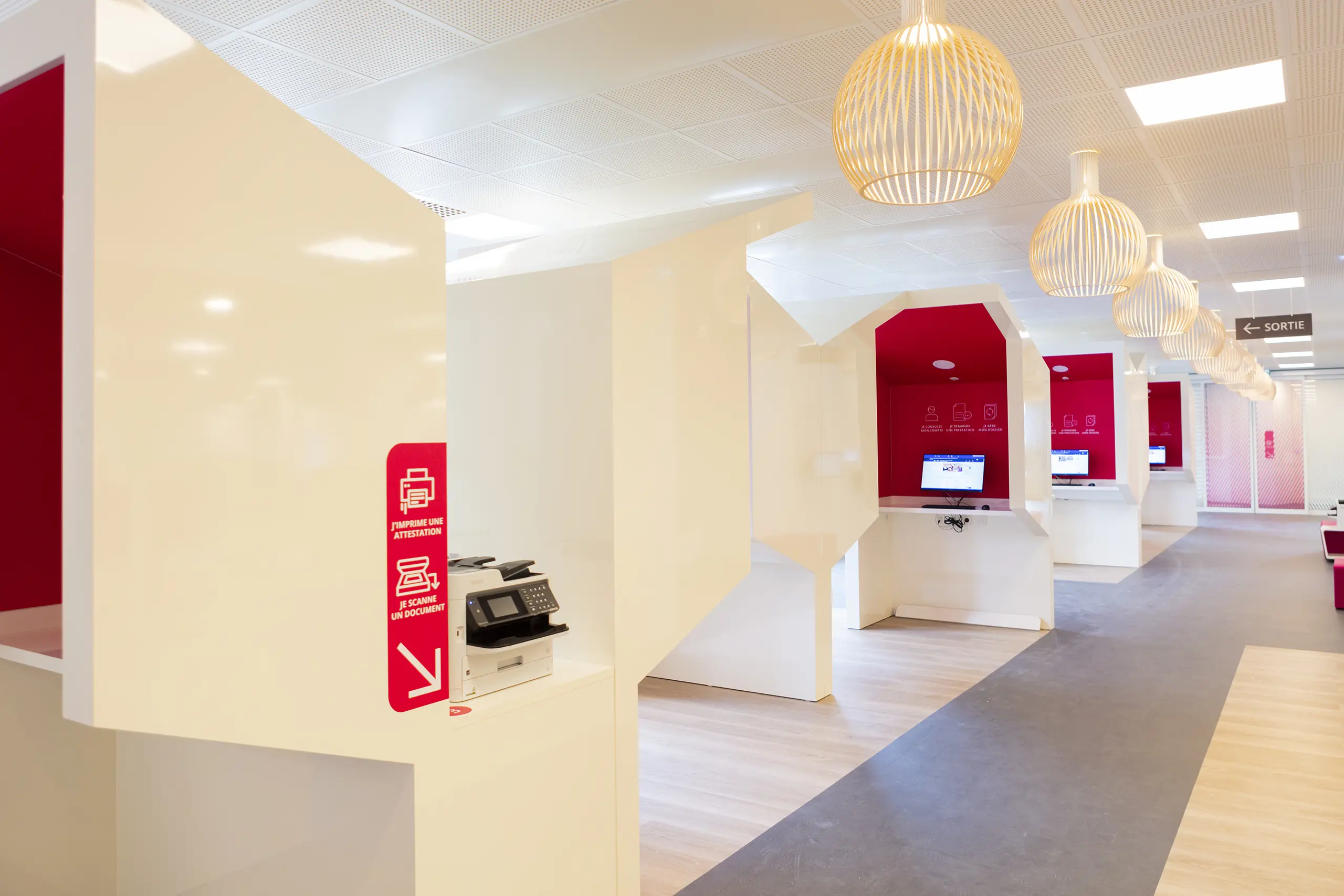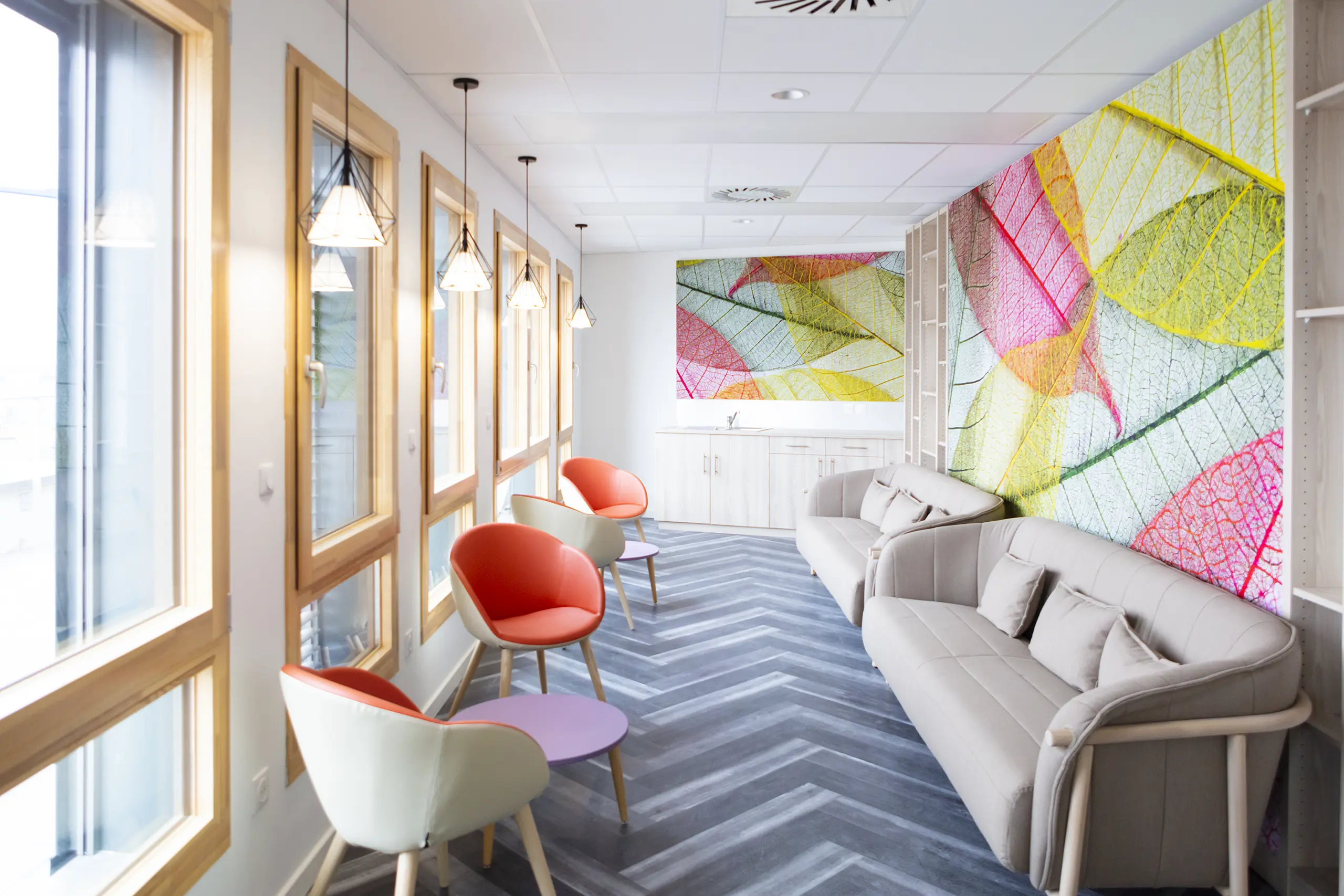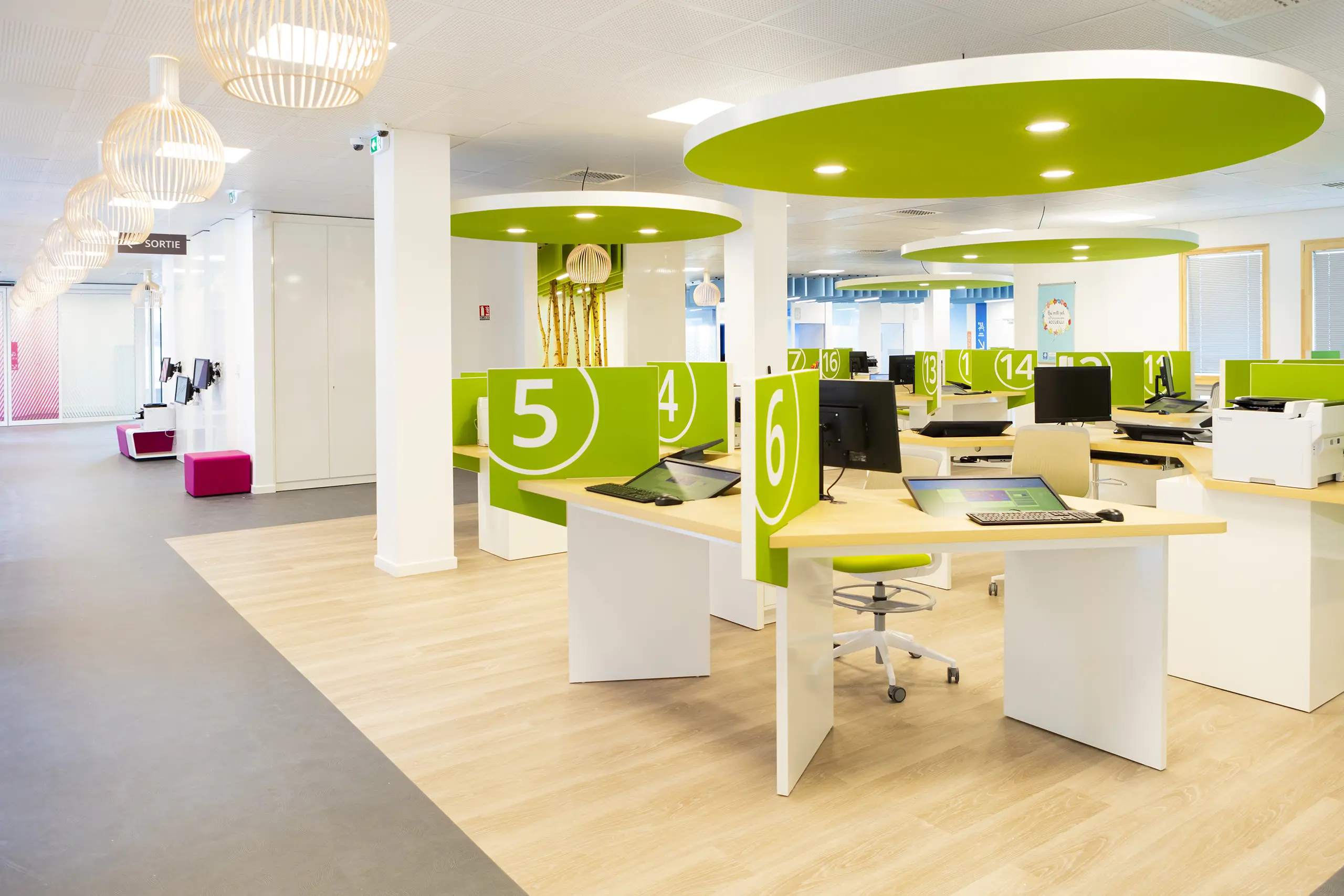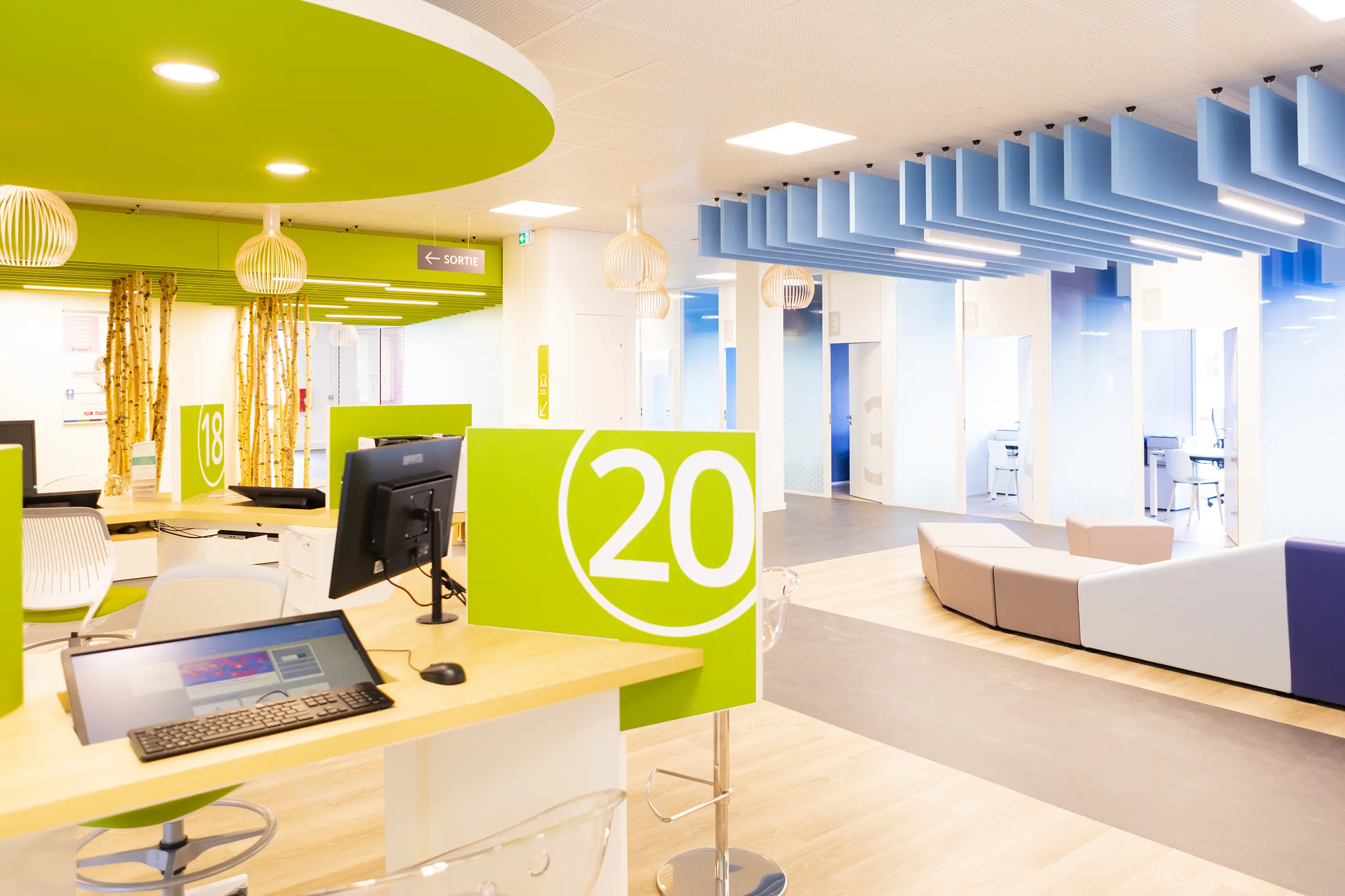 Behörden sind immer grau, trist und abschreckend? Auf keinen Fall, wie dieser Fall beweist! In diesem Beispiel aus Frankreich sind Acoustic frames als Ceiling panels, Wall pictures, Baffel und als schallgedämmte Boxen eingesetzt. Mit den bunten, ebenmäßig gedruckten Motiven sorgen sie für eine einladende Atmosphäre, während das innenliegende schallabsorbierende Basotect für Privatsphäre bei den Beratungen und persönlichen Gesprächen sorgt.