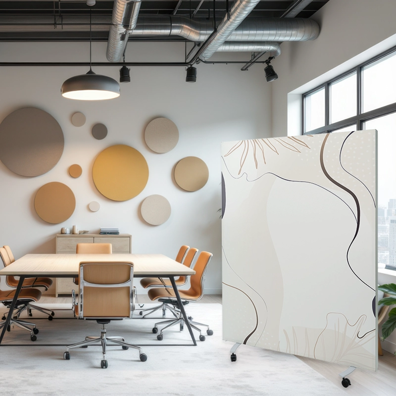 Our mobile room divider is the ideal solution for flexible room design. Covered on both sides and equipped with permanently mounted casters, it can be easily moved and repositioned. This allows you to create variable work areas and creative zones in no time at all.