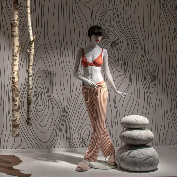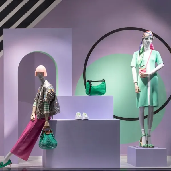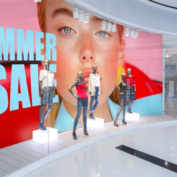 Die Schaufensterrückwand schafft kreative Inszenierungen für wechselnde Retail-Kampagnen. Beidseitig bespannt und auf Wunsch mit LED-Beleuchtung ausgestattet, wird sie zu einem markanten Blickfang im Store.
